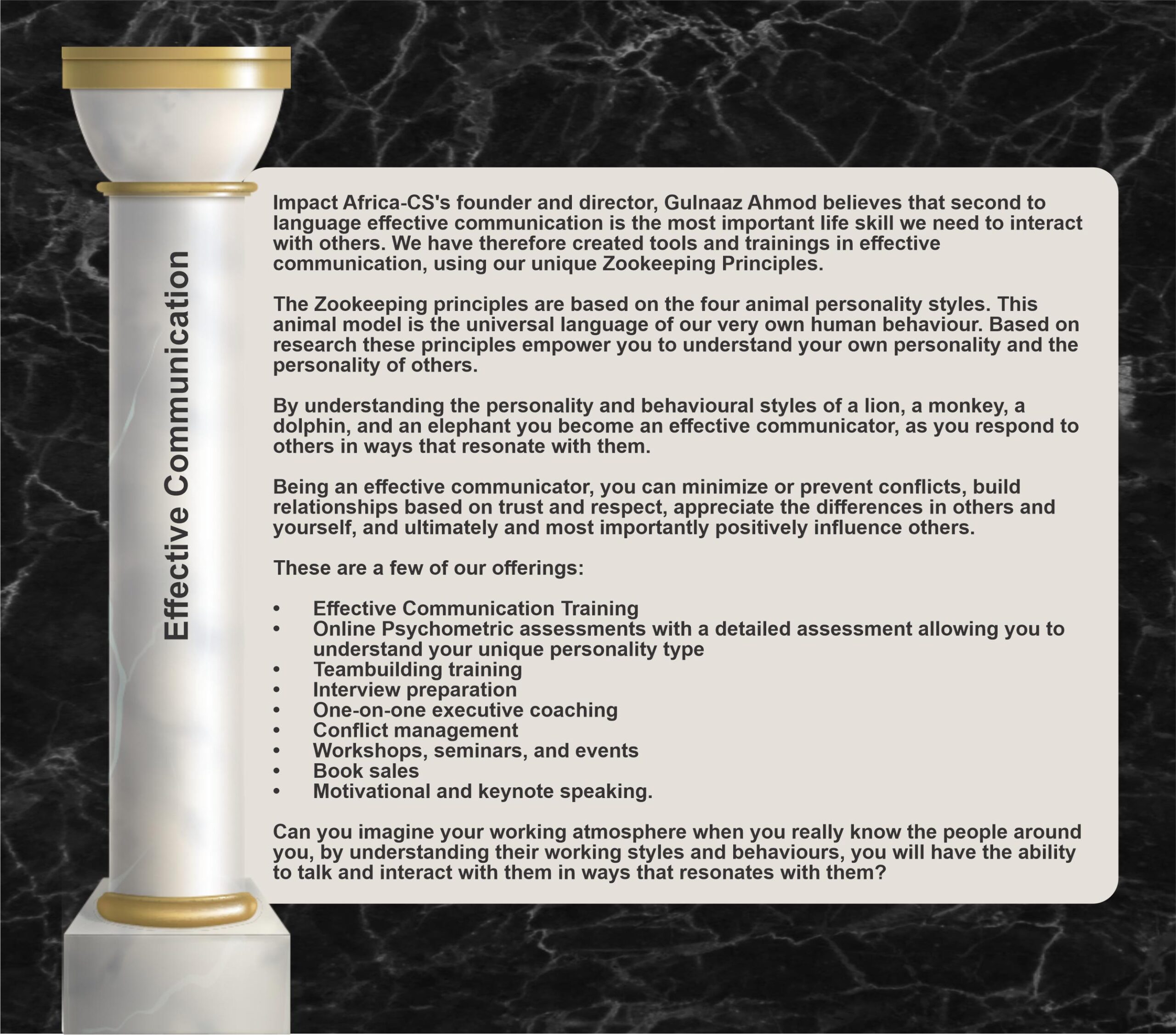 At Impact Africa-CS our offerings are based on four distinct pillars; each pillar has a unique offering and is backed by 30 years of experience and expertise in the field.